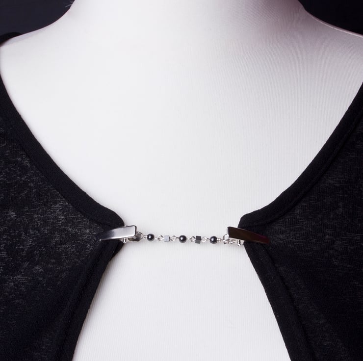 Such a useful little clip chain. It can be used to hold together a buttonless cardigan, shawl or pashmina. You could even use it at the back of a top that is too big to make it more fitted, or as an ID badge holder.