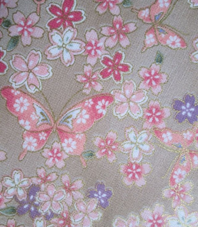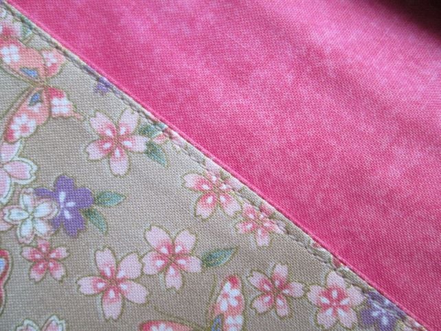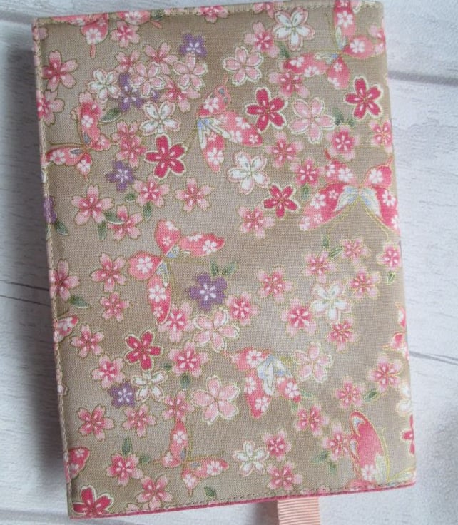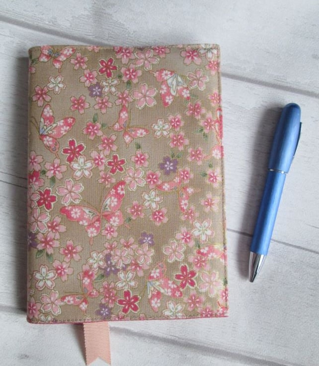 A really pretty reusable notebook cover in pale gold cotton patterned with pink, white and lilac flowers and pink floral butterflies, all picked out in metallic gold. I've lined it with raspberry pink cotton and incorporated a ribbon place marker. Comes complete with an A6 lined notebook. A matching zip top bag also available.