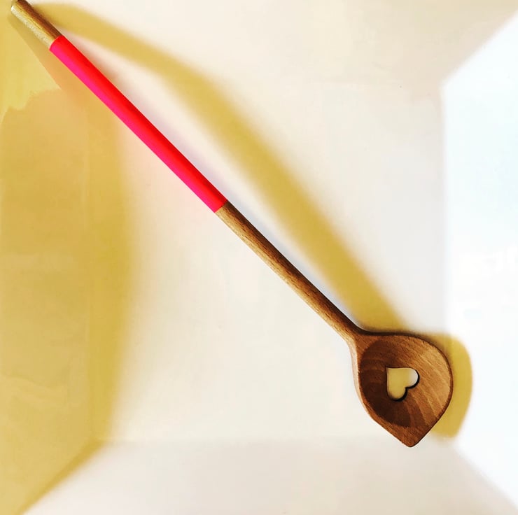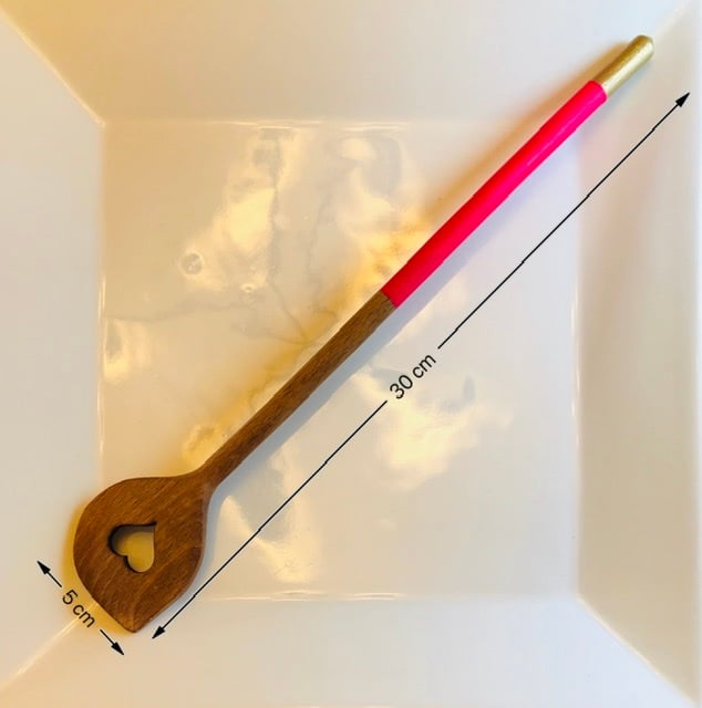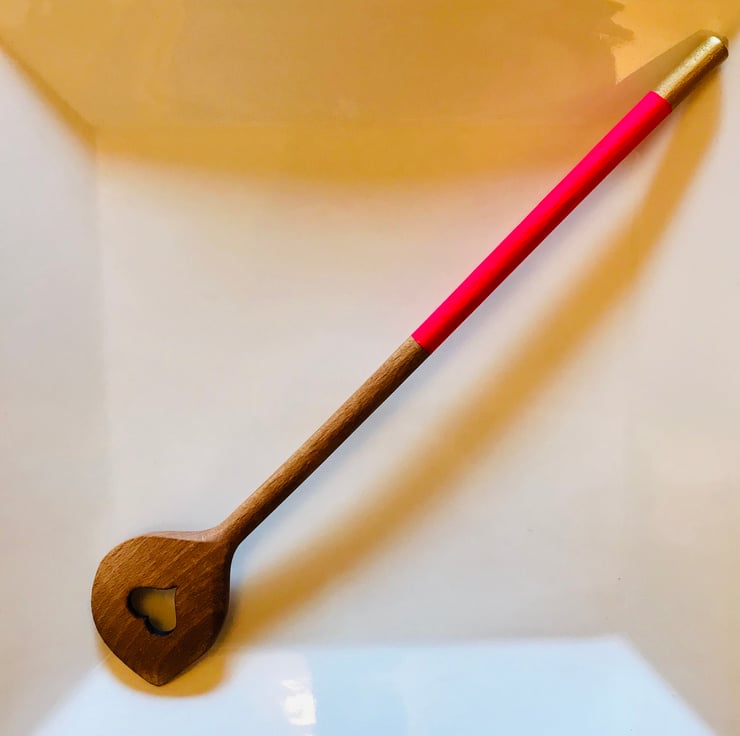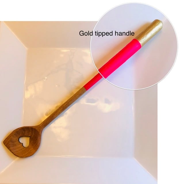 A really bright and fun neon pink has been applied to the handle of this carved wooden spoon, and a gold tip gives this humble piece a touch of glamour. The spoon has been treated with a food safe Butcher’s Block Conditioning oil (Tung oil). Hand washing is recommended, or top drawer of dishwasher if you must.