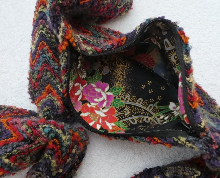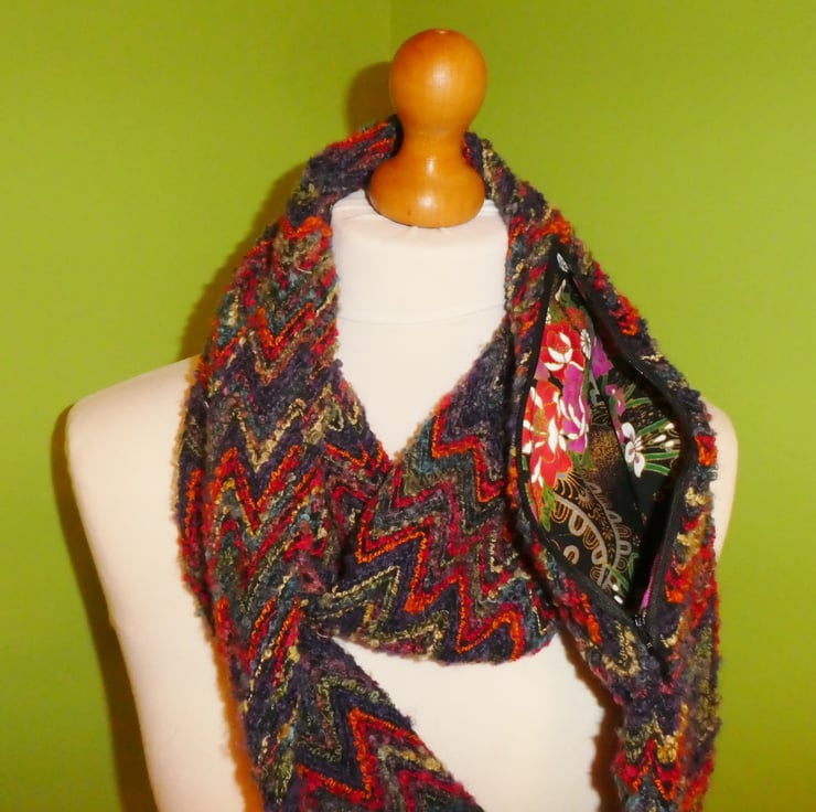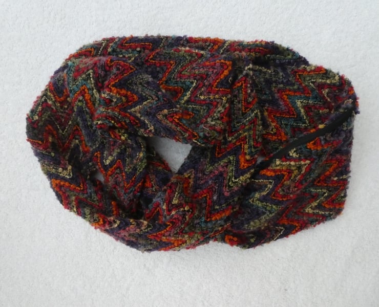 I have created this fantastic infinity cowl to keep you warm and snug. The fabric is a lovely woven zig zag pattern, and is double thickness. On one side, there is a hidden zipped pocket, handy for small items such as keys or a phone, when you are out and about. Pocket opening is 8" and 4.5" deep.