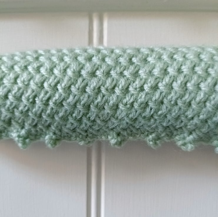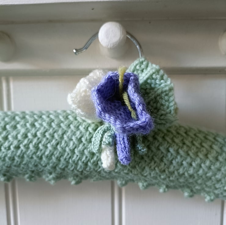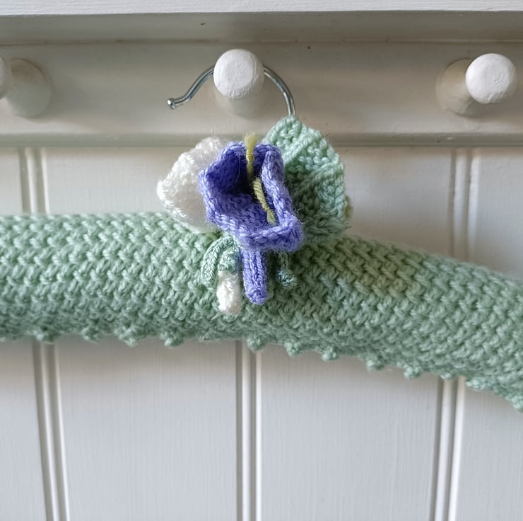 A beautiful hand knitted ladies padded coat hanger. The cover is knitted in a pale green coloured yarn using an all over textured stitch. The bottom hem is bound with a crocheted picot edging, using the same green coloured yarn. There are three hand knitted crocus flowers nestled under the metal hook, in lilac, cream and pale green yarn, all with lime green stamens. These flowers are secured to the hanger with a handmade cord in the same pale green coloured yarn. The wooden hanger is generously wrapped in wadding giving a soft body to the hanger.