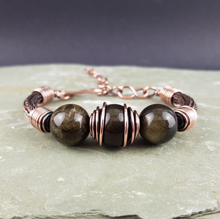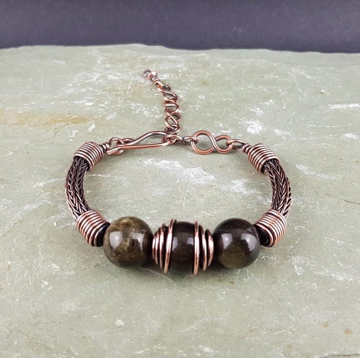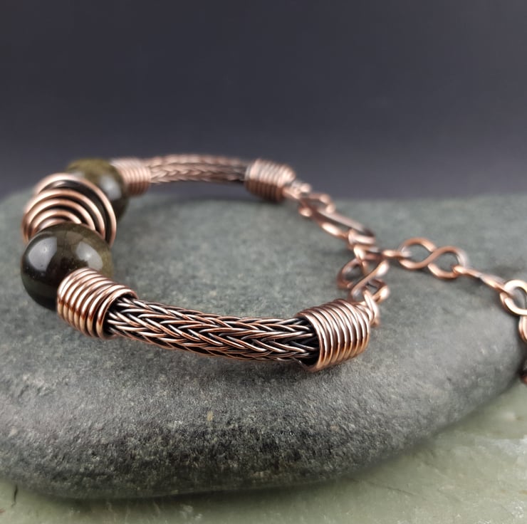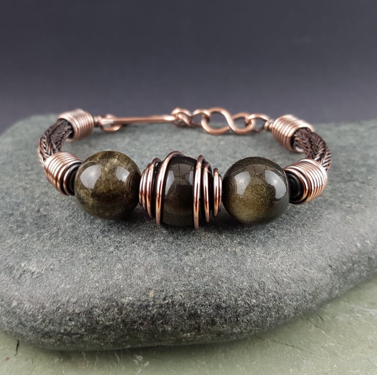 This striking unisex bracelet has been made using a traditional viking weave technique and solid copper wire to form the sides of the bracelet. I have added three golden obsidian beads at the centre then finished it with handmade end caps, clasp and extension chain.