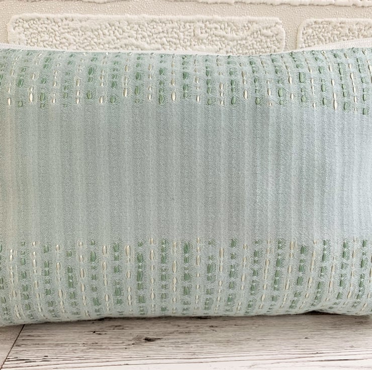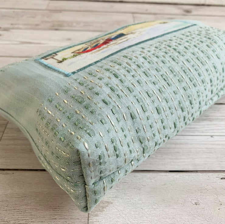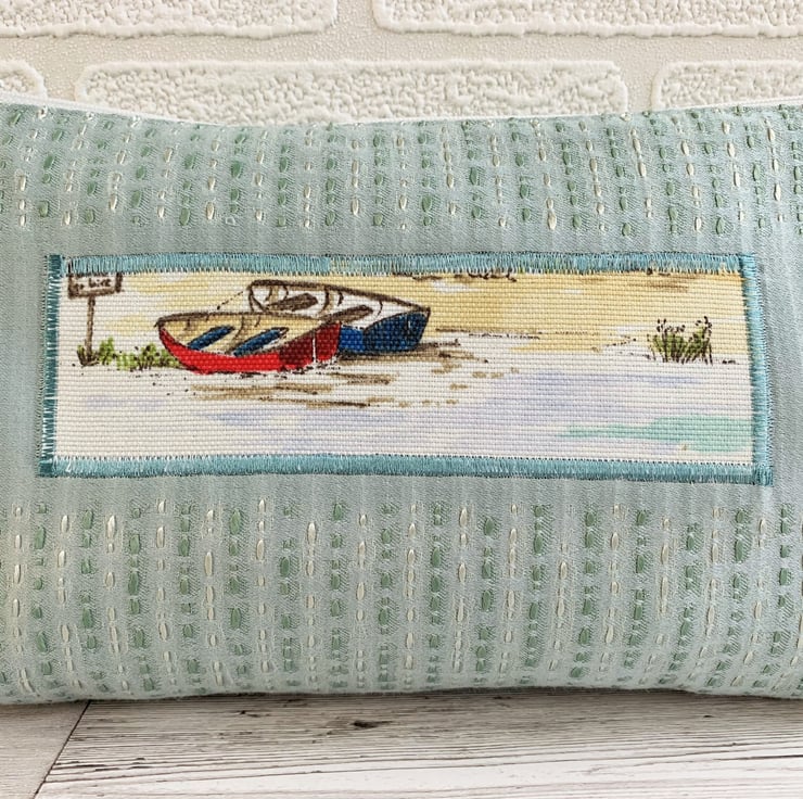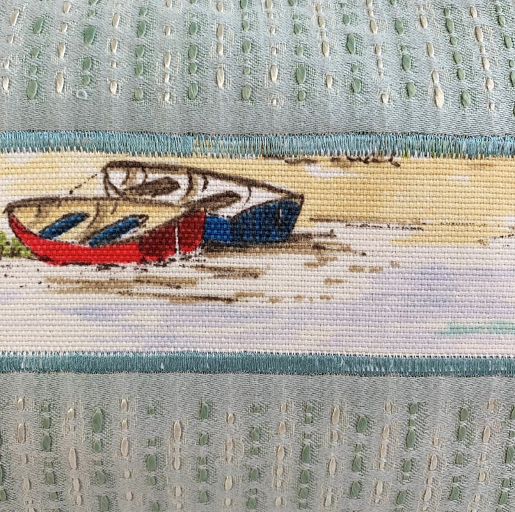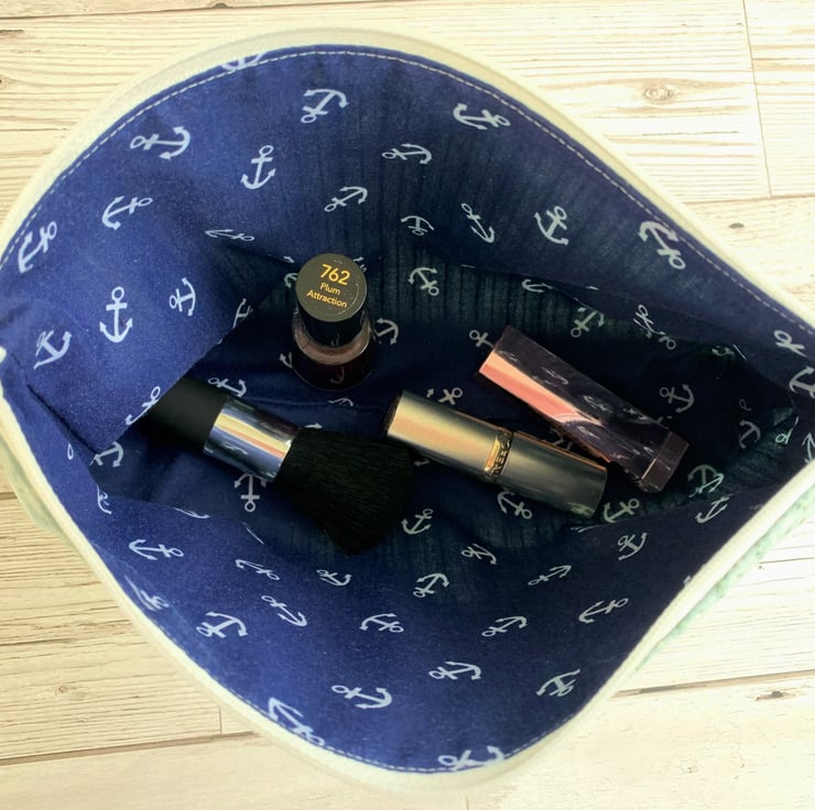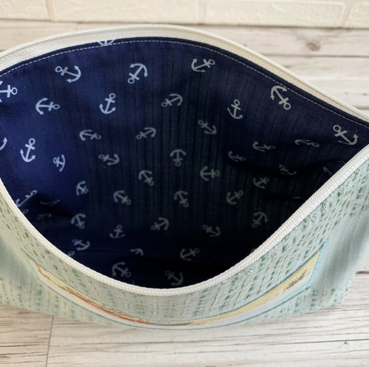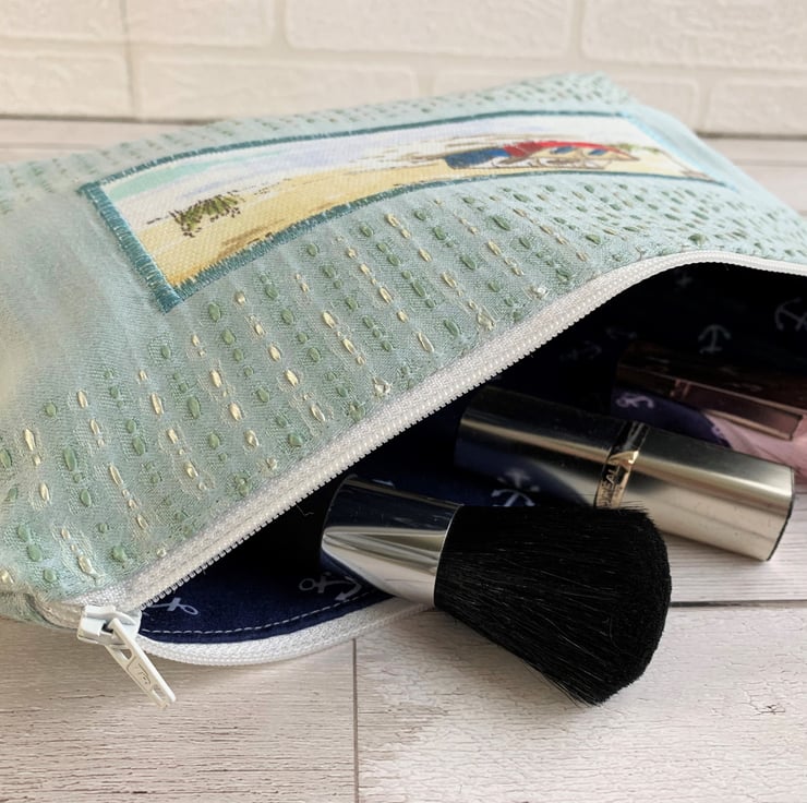 A large sized make up bag in luxurious duck-egg blue fabric with a pattern of white and duck-egg blue running stitch detail. The stitch detail has a slight sheen. The cosmetic bag is embellished with a decorative print panel which features a lovely coastal scene with two rowing boats. The boats, one red and one blue, are sitting on the edge of golden sand, which is dotted with green grasses. The sea in front is the palest blue and duck-egg blue. I've edged the panel with machined satin stitch in a slightly darker shade of duck-egg blue. The cosmetic bag fastens with a white zip and is lined with nautical fabric with a pattern of white anchors on a navy blue background. The base of the bag is boxed giving lots of space inside.