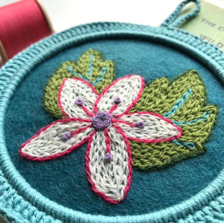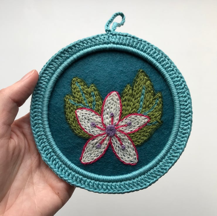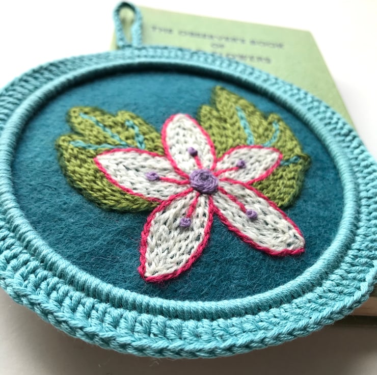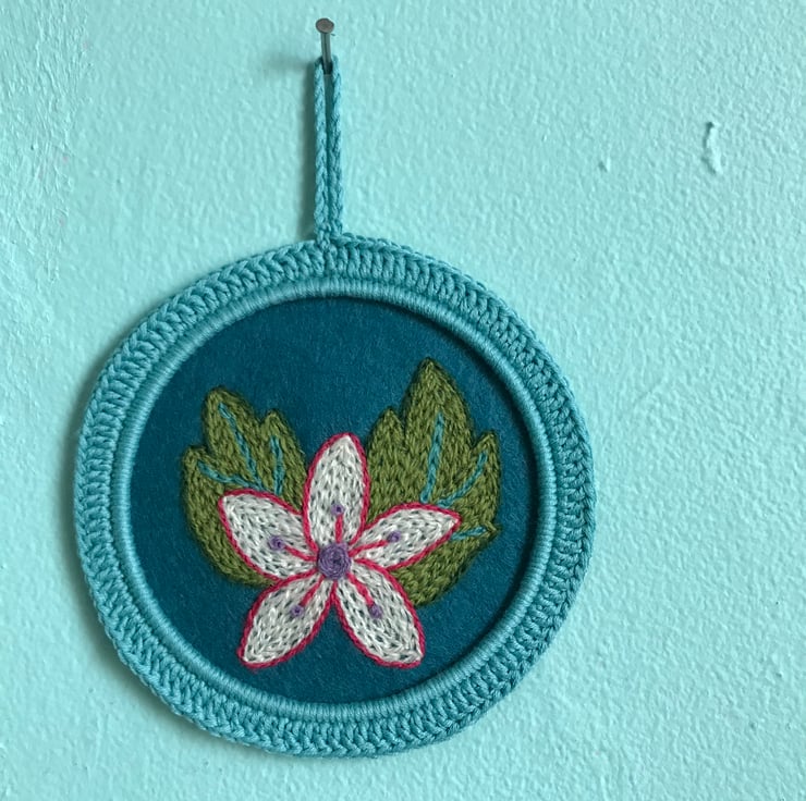 Hand embroidered onto wool felt using beautiful Appleton’s crewel wool, this elegant flower wall decoration will brighten any room. Treat yourself or give as a gift to a gardener.