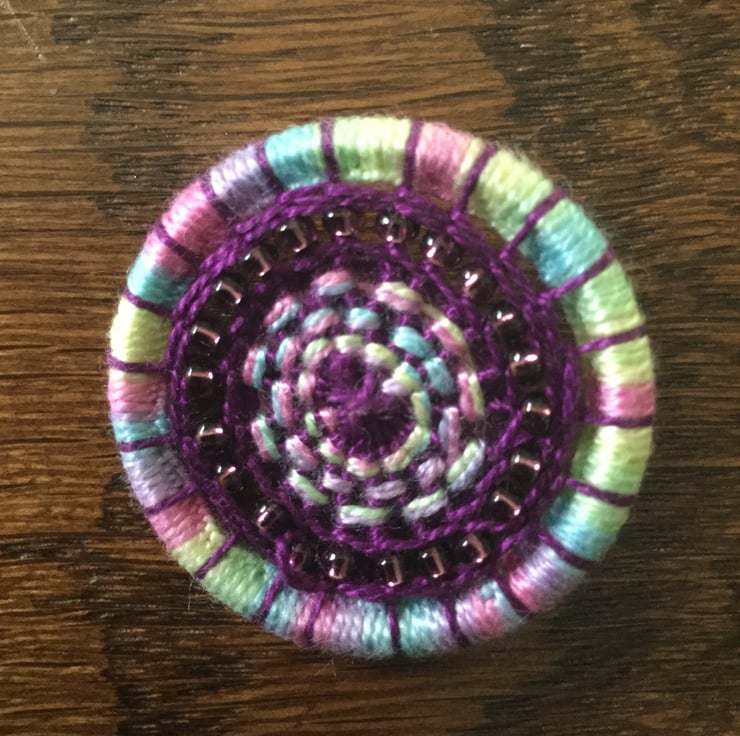 The brooch is worked on a 32mm metal ring and is light to post and makes a perfect small present for the person who has everything!