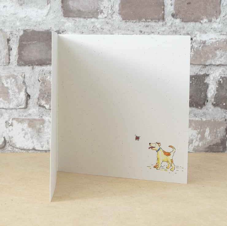 This eco friendly 'Dog and Butterfly' card has been printed using 100% recycled oatmeal finish style 320g card using my own original artwork and left blank inside for your own special message. This is a lovely card for a Birthday, or any occasion for any dog lover. These oatmeal cards have lovely naturally occurring flecks as shown in photographs above.