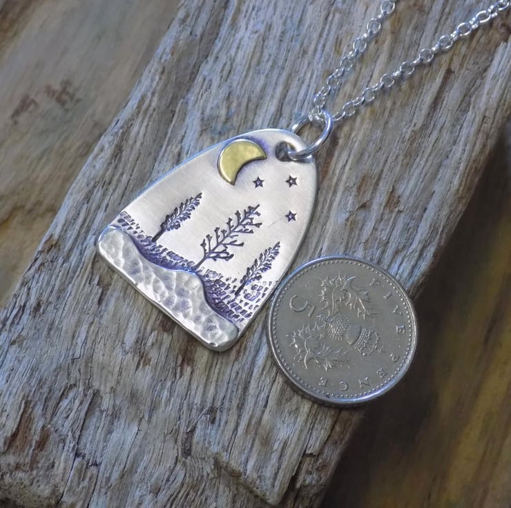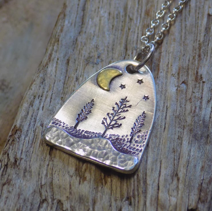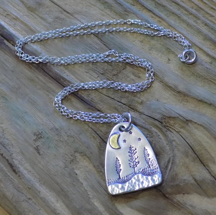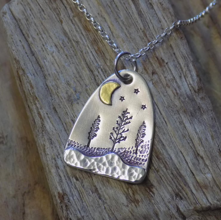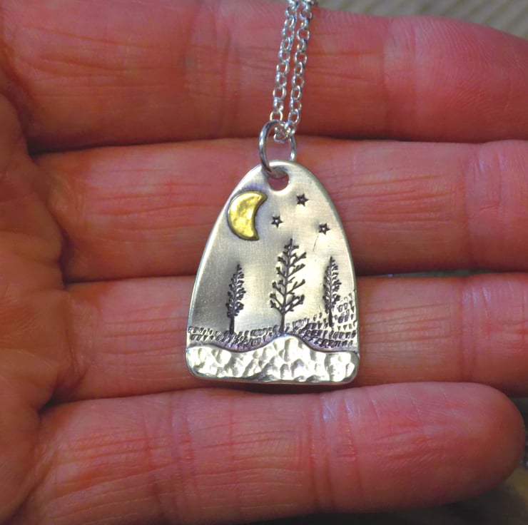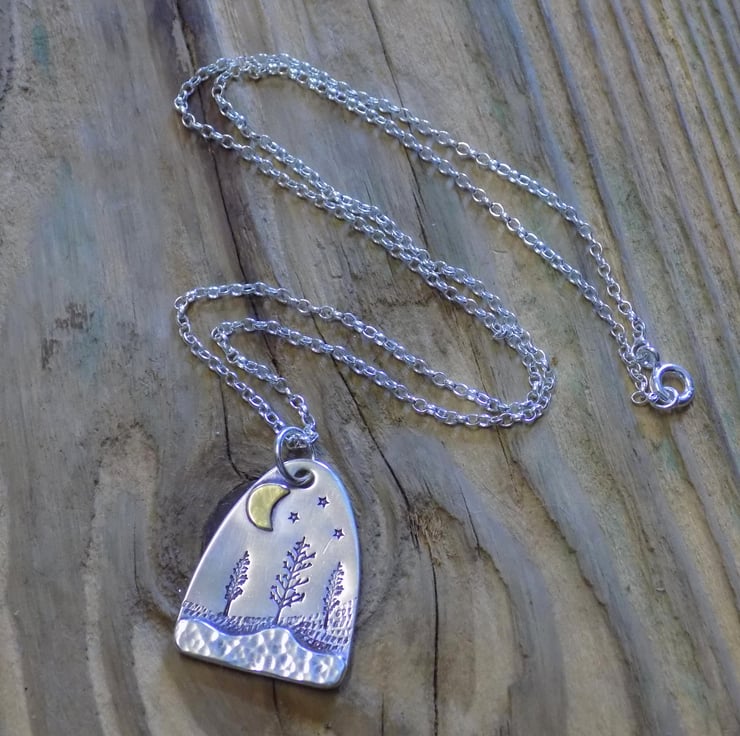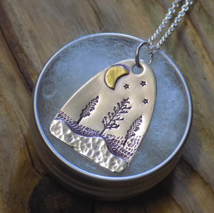 Made from sterling silver sheet and a little bit of brass. A layer of silver has been carefully soldered to the bottom of the pendant which has a dappled finish to give the effect of snow in the foreground. The middleground has been given a little texture and some winter trees, and a brass moon has been added along with a few twinkling stars to set the scene. Simply hung on an 18" sterling silver belcher chain.