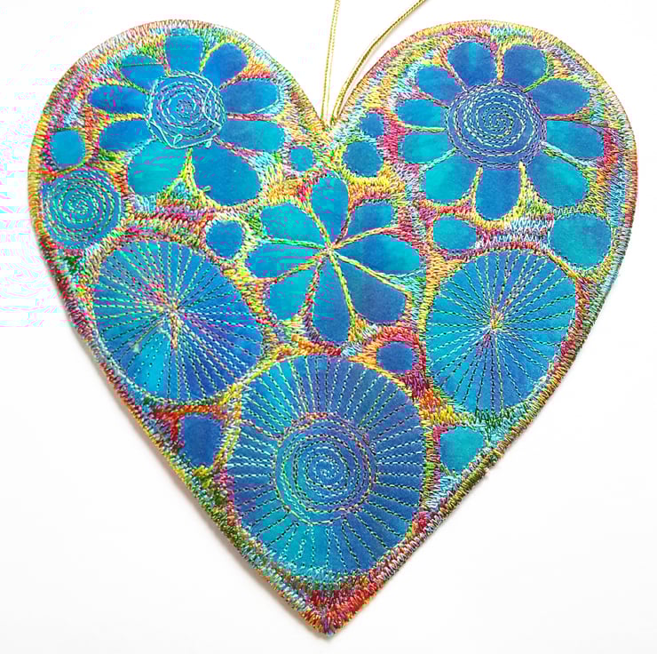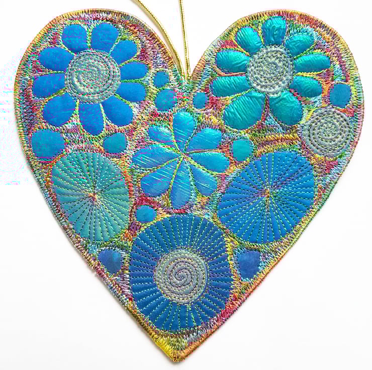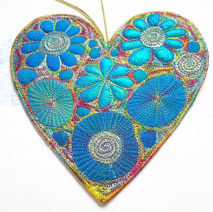 Made from layers of fabric including hand dyed Egyptian cotton and silk fabrics using the free machine embroidery style of sewing