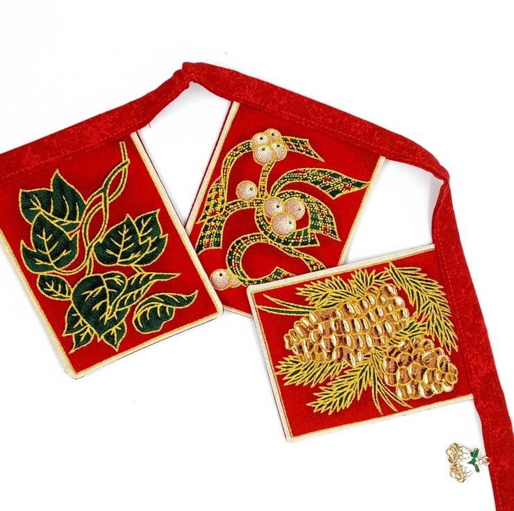 Ivy, mistletoe and pinecones are in a repeat pattern, and there are some Christmas bells at each end