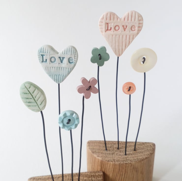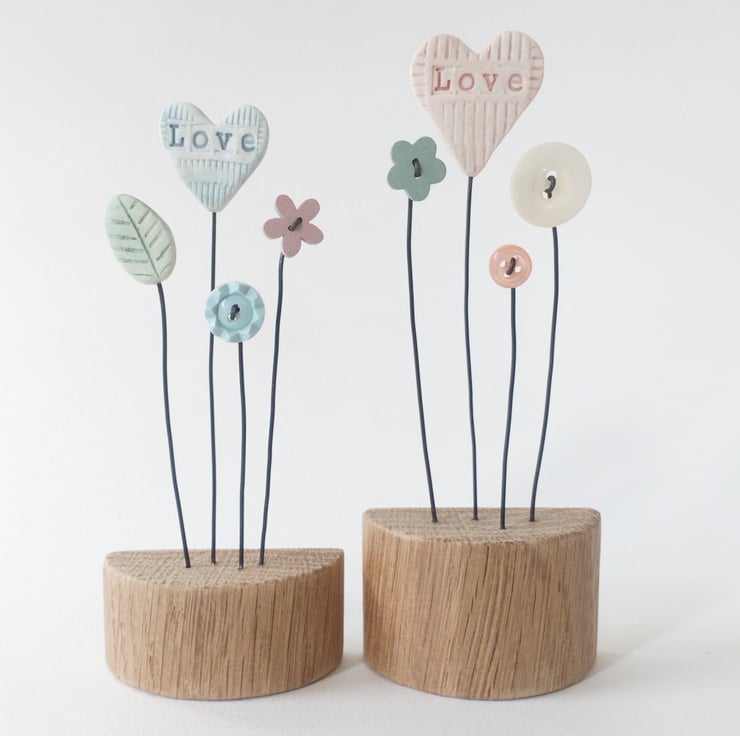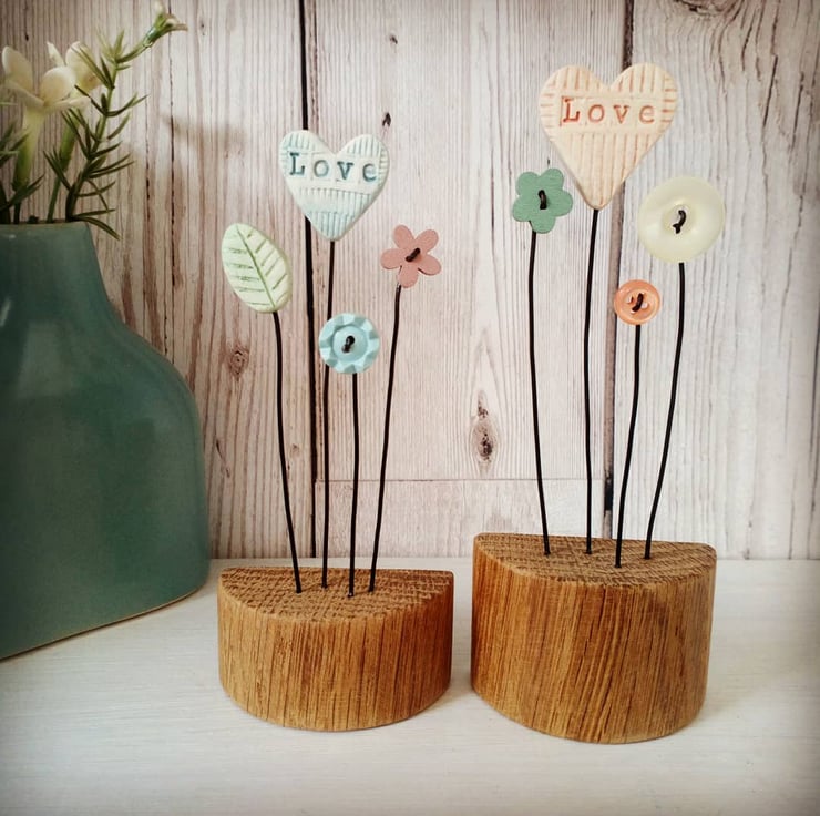 This heart and leaf are handmade from fired and painted polymer clay. They stand on wire stalks alongside two little button flowers in a sanded and waxed oak block.