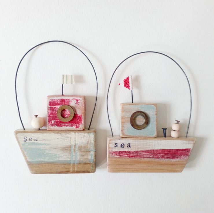 Made from hand painted wood with an old washer for a window, a flag and a bead buoy add to the seaside feel of this little hand crafted boat.
