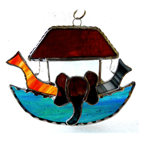 There are two little 'lamps' made from crystal glass beads hanging from the roof. I have 'tiled' the top of the roof by adding a piece of twisted wire and added a wave effect round the hull with decorative copper foil and solder.