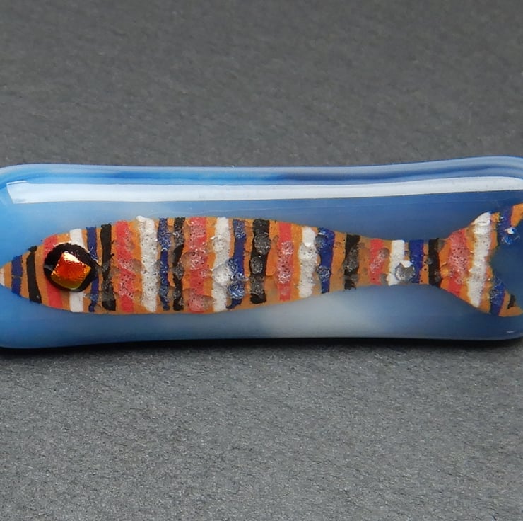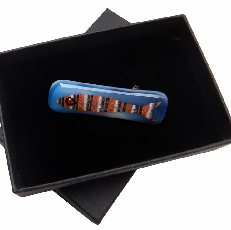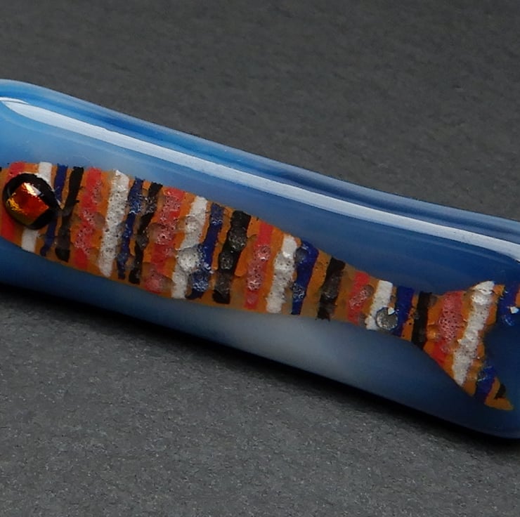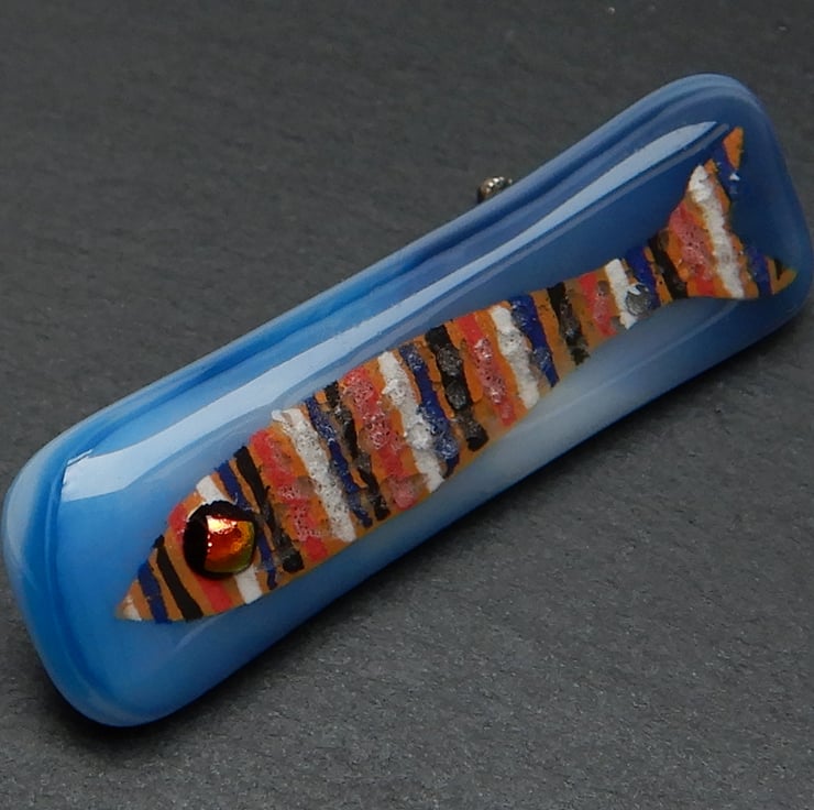 UNIQUE: Handmade Fused Glass 'SARDINE' Brooch. The little fish has been very carefully hand painted onto the surface of a wispy blue glass backing. No paint has been used but instead it is very finely ground fusing glass mixed with water. At this stage the blending of colours and adding of details was possible. The eye of the fish is made from metallic dichroic glass. Finally transparent glass was sprinkled onto the surface, to give the brooch an aquatic finish. The brooch was then fired in my kiln and the powdered glass and background fuse to become one piece.