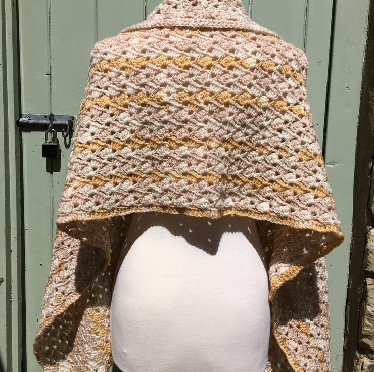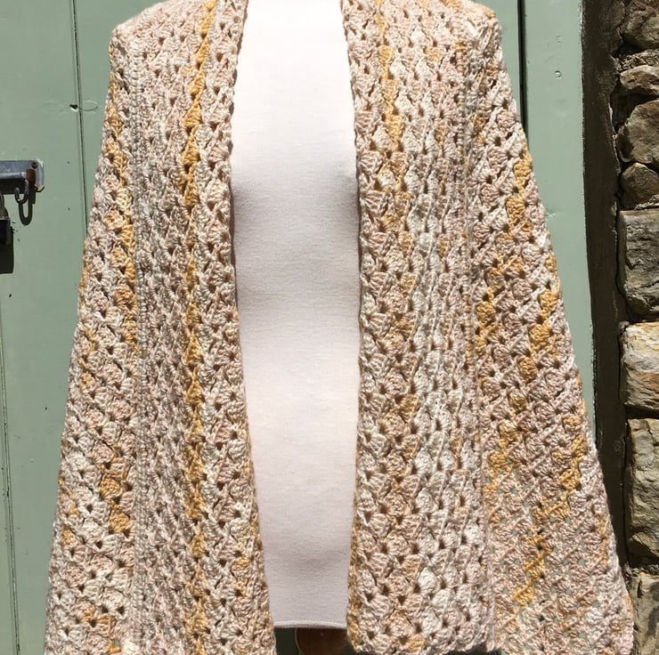 The shawl is generous in size, pictured on a standard UK size 12 dummy. But light in feel due to the softness of the yarn and the lace stitch used.