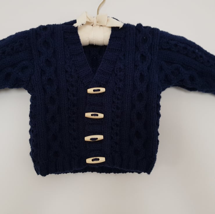It has a 'v' neck and fastens with 4 wood toggle buttons.