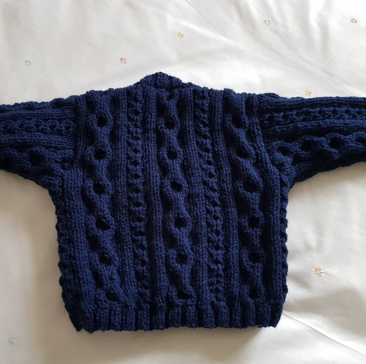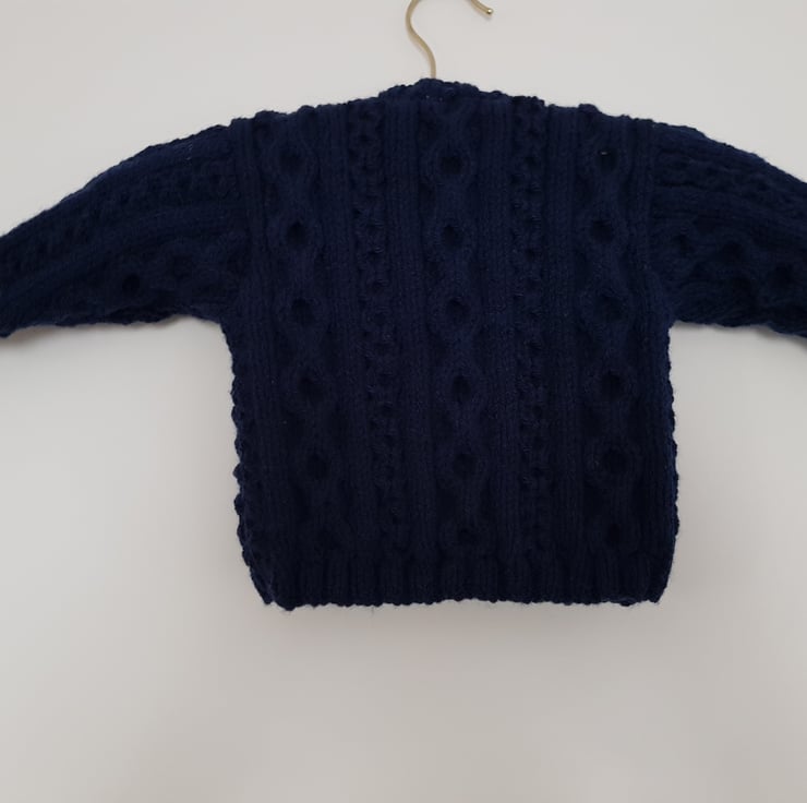 It is knitted in navy blue aran yarn which is quite thick. So it will be warm and cosy.