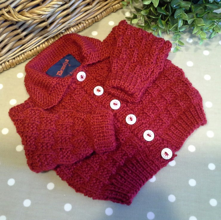 A practical unisex baby cardigan designed and totally hand crafted using top quality British manufactured 75% Marino wool yarn with a 25% acrylic mix for total luxury and warmth this winter. The yarn is machine washable at low temperaturesettings. The buttons are made from genuine wood with a delicate red design on them. The garment has the branded designer 'Demelza' label attached to the back neck edge with the care instructions woven on the reverse side for lasting reference.