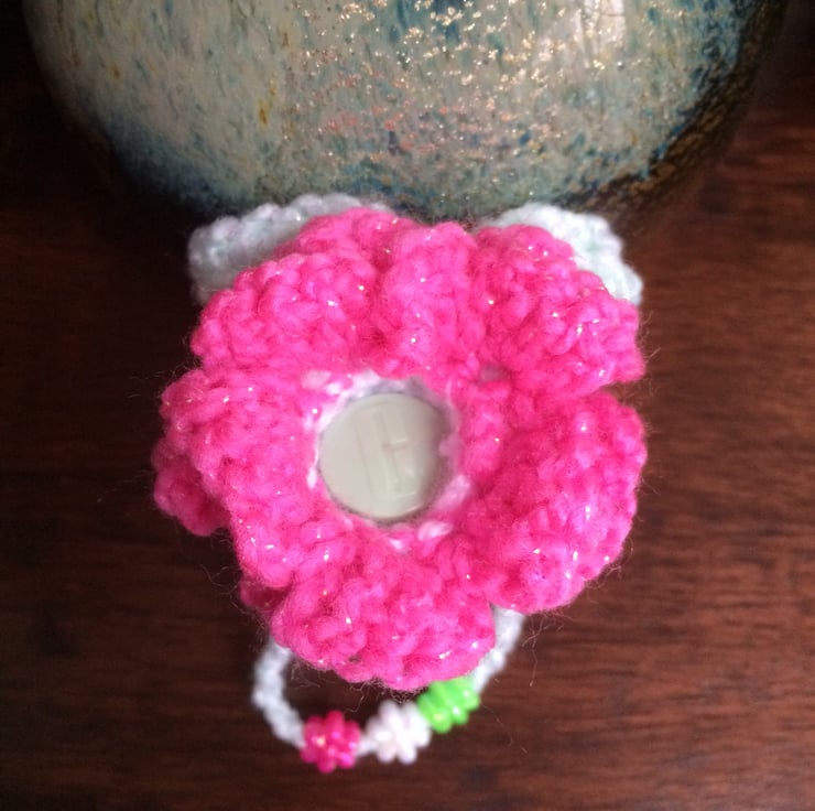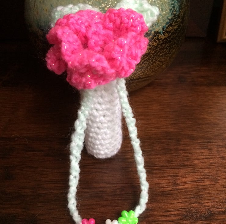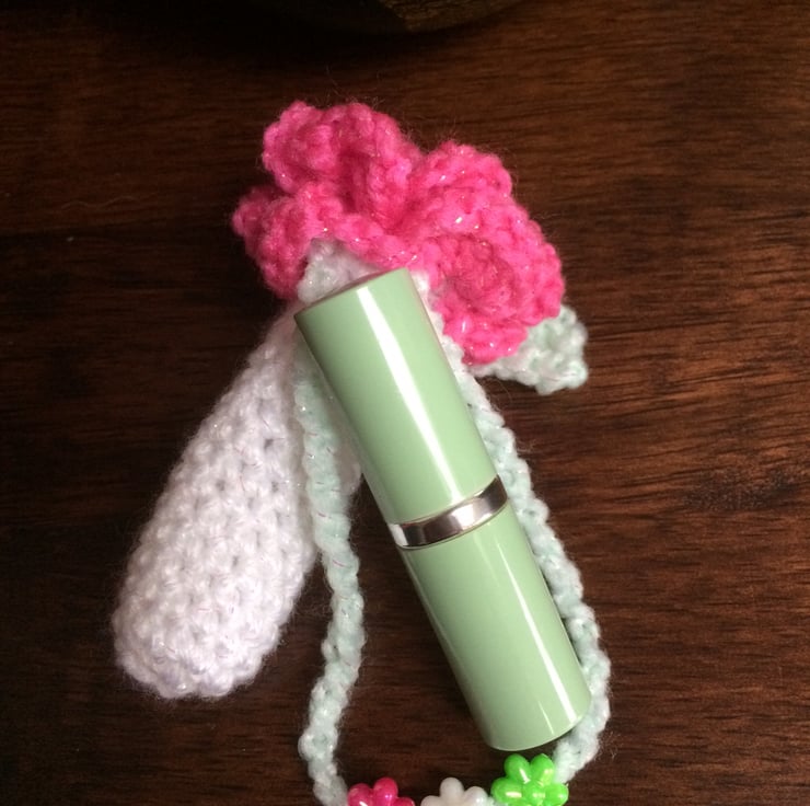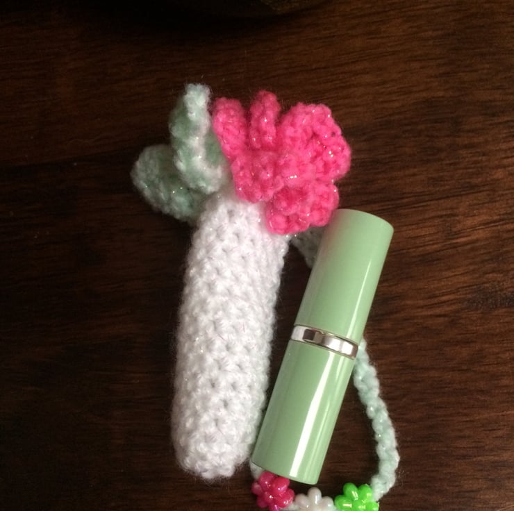 I have hand crocheted this pretty drawstring lipstick holder in luxury sparkle yarns. The top of the pouch has a hot pink flower with mint green leaves. The drawstring is mint green and has been finished with three flower beads in pink, green and white.