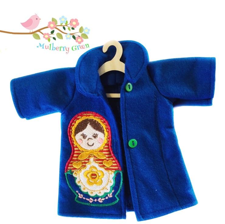 A lovely little royal blue tailored coat to fit the Mulberry Green dolls. The coat is embroidered and appliquéd with a cute Russian doll on the front and has two little green buttons. It comes on a little wooden hanger.