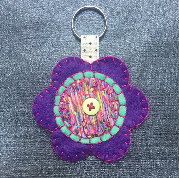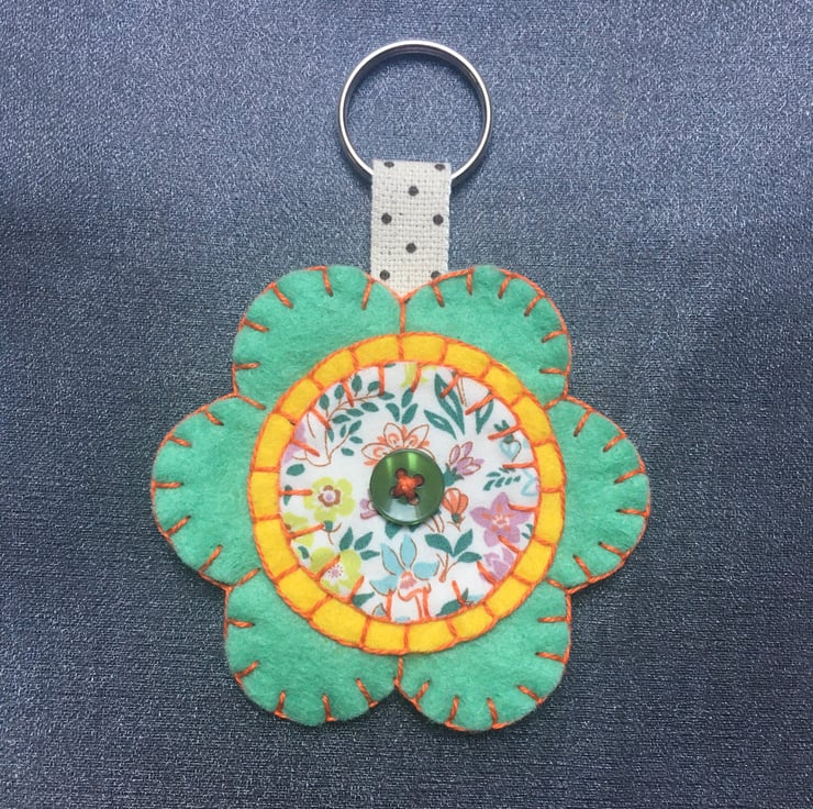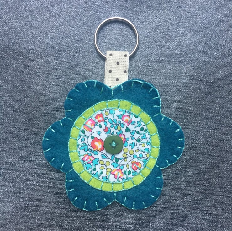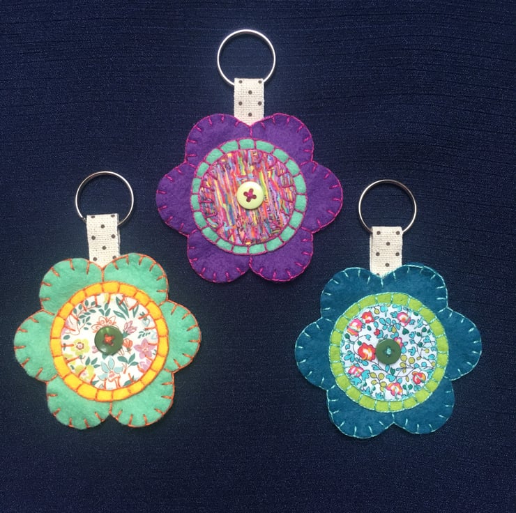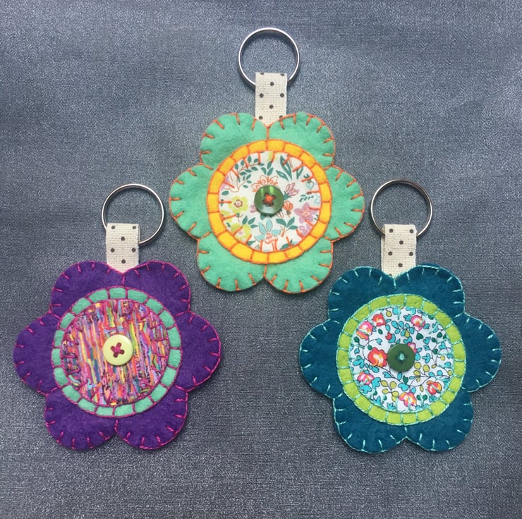 The keyrings have been hand cut and sewn using a wool blend felt and Liberty of London fabrics. They have been finished with a button and complimentary embroidery thread.