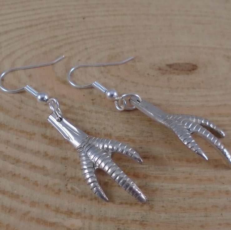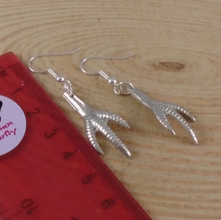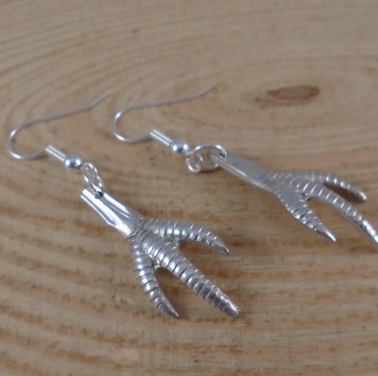 An unusual and quirky pair of earrings, hand made from an old pair of silver plated sugar tongs. The claw ends of the tongs have been sawn off, and a hole has been drilled in the top so they can be attached to silver plated ear wires.