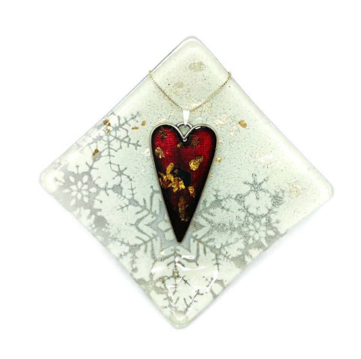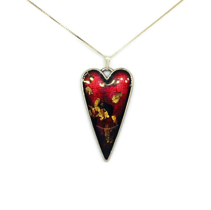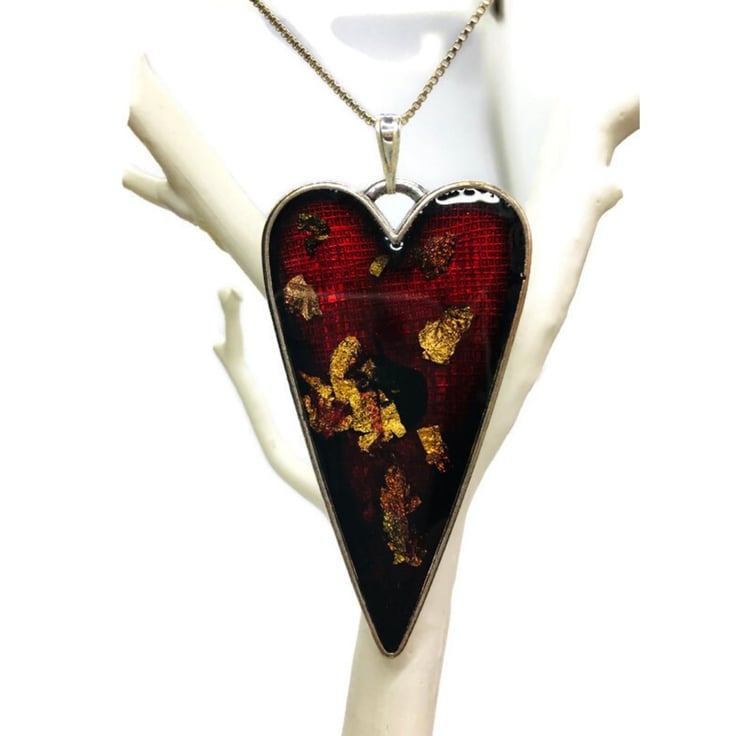 Heart necklace with gold and copper leaf flakes embedded into the red resin set in a silver plated bezel supplied on a sterling silver 18 inch chain. Large red heart statement pendant.