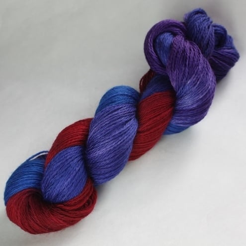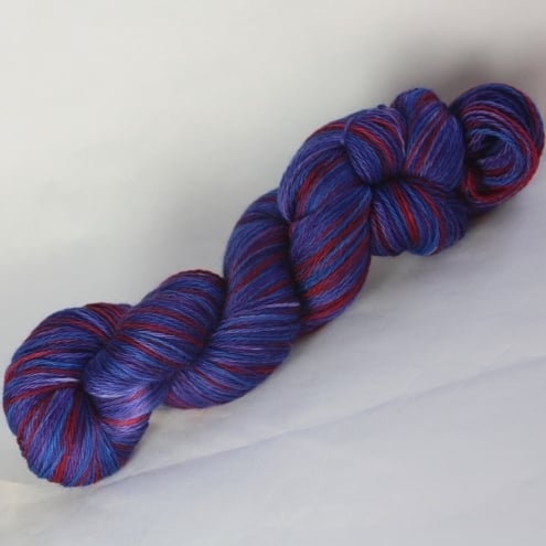 In red, blue and iris-purple, this soft and squishy yarn should make wonderful socks, or other projects requiring sock-weight yarn. The yarn has been reskeined as shown in the first two photographs, but is shown in the third photo before reskeining, for reference only. This yarn is likely to form a repeating pattern as it is worked.