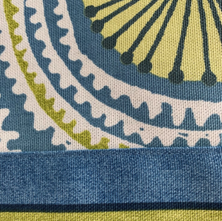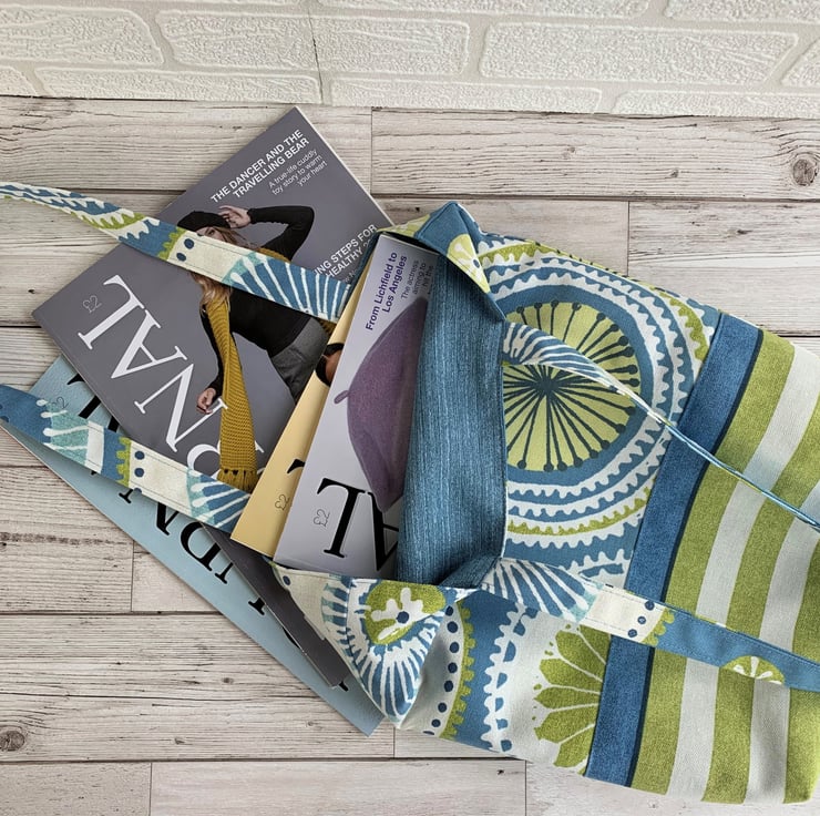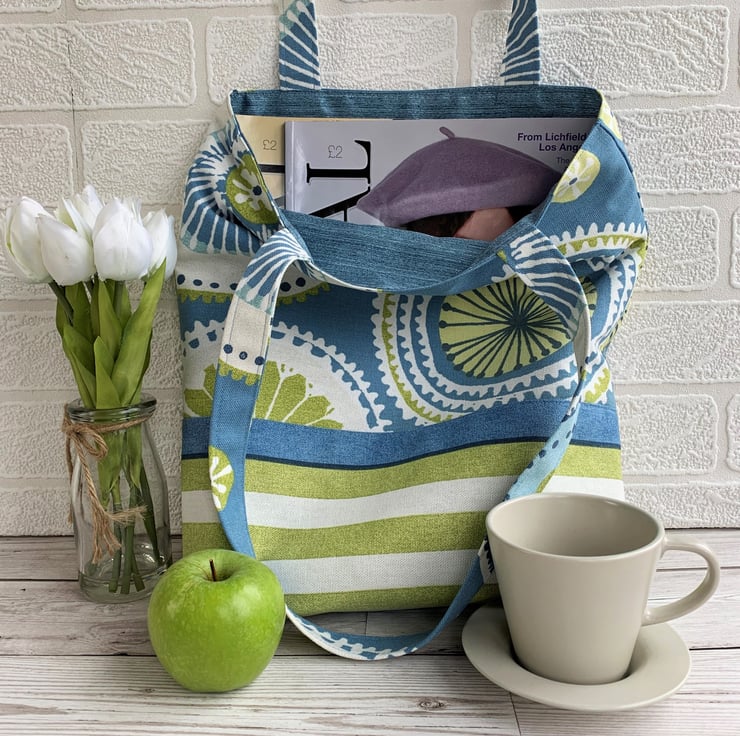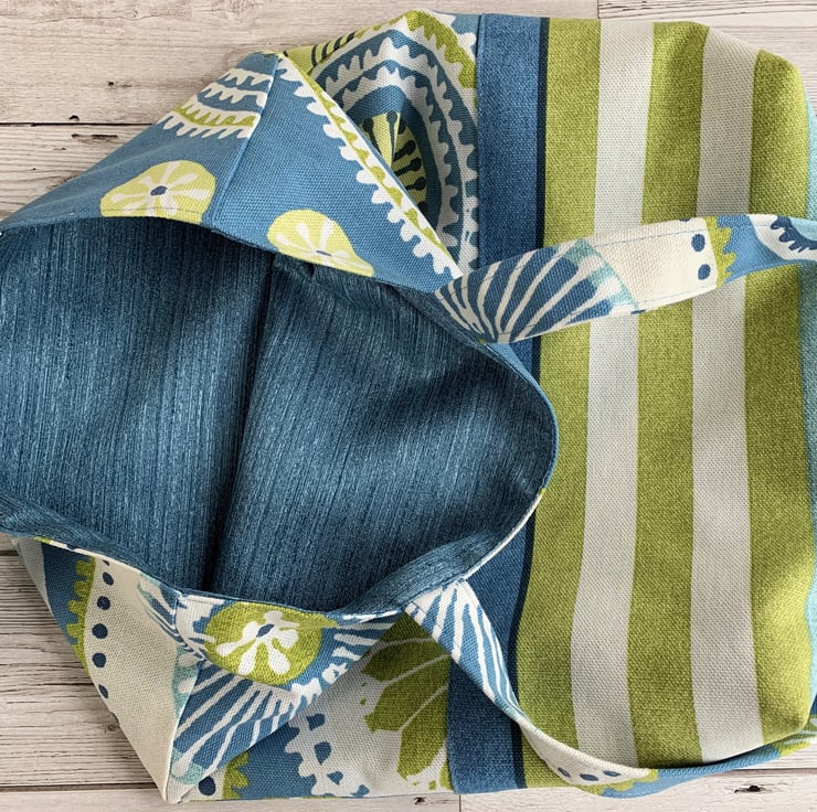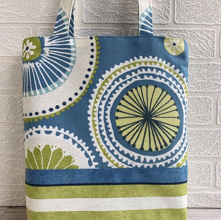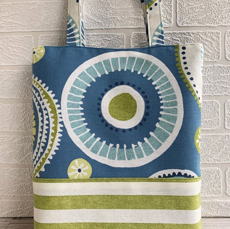 A handy tote bag in two co-ordinating print fabrics. The lower fabric features horizontal stripes in blue, lime green and white. The upper fabric features large circles with a variety of bold patterns, along with a few small patterned circles. It has the same colours as the striped fabric with some additional shades of blue and yellow-green. The handles are made from the same circle-pattern fabric as the upper part of the bag. The tote bag is lined with blue fabric with a slight sheen.