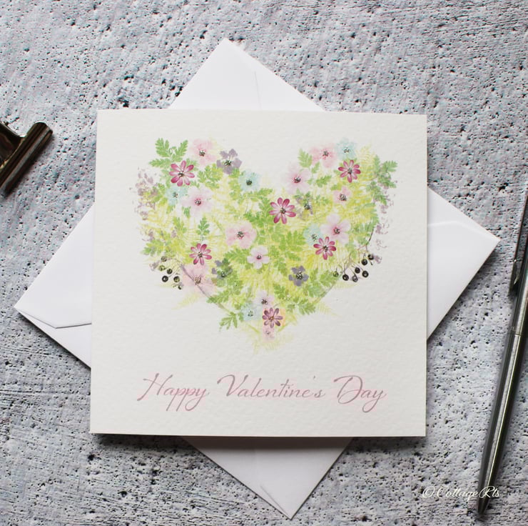 This floral heart design has been created using our own original watercolour paintings and prints. It has then been digitally printed on to heavy cardstock before being hand finished with glitter.