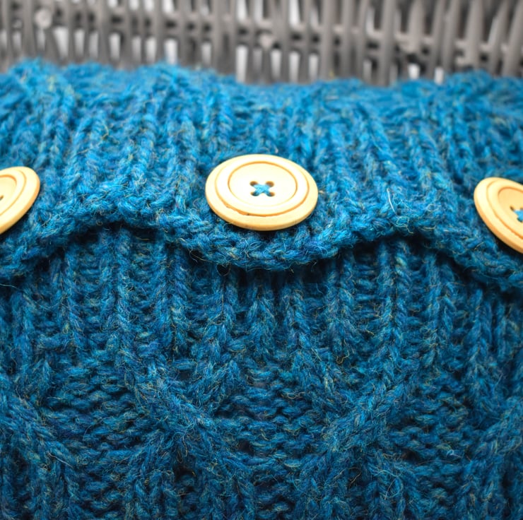 Knitted with a stunning jewel like teal Shetland aran weight wool in a traditional cable pattern in an envelope design and secured with turned wooden buttons.