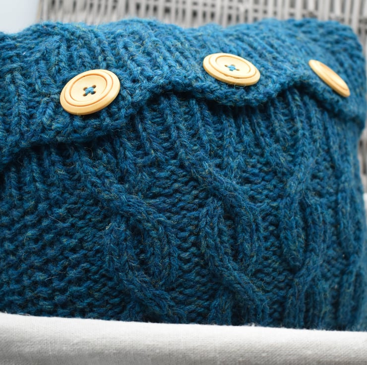 Hand Knitted Shetland wool Aran design cushion 12"x12" in TEAL