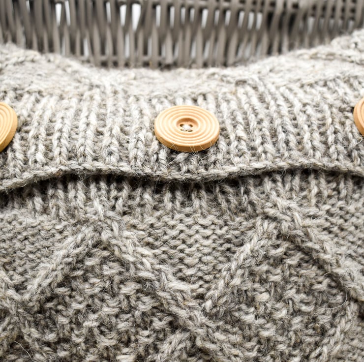 Knitted with an undyed North Ronaldsay aran weight wool in a traditional cable diamond pattern in an envelope design and secured with turned wooden buttons.
