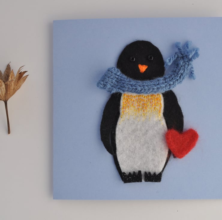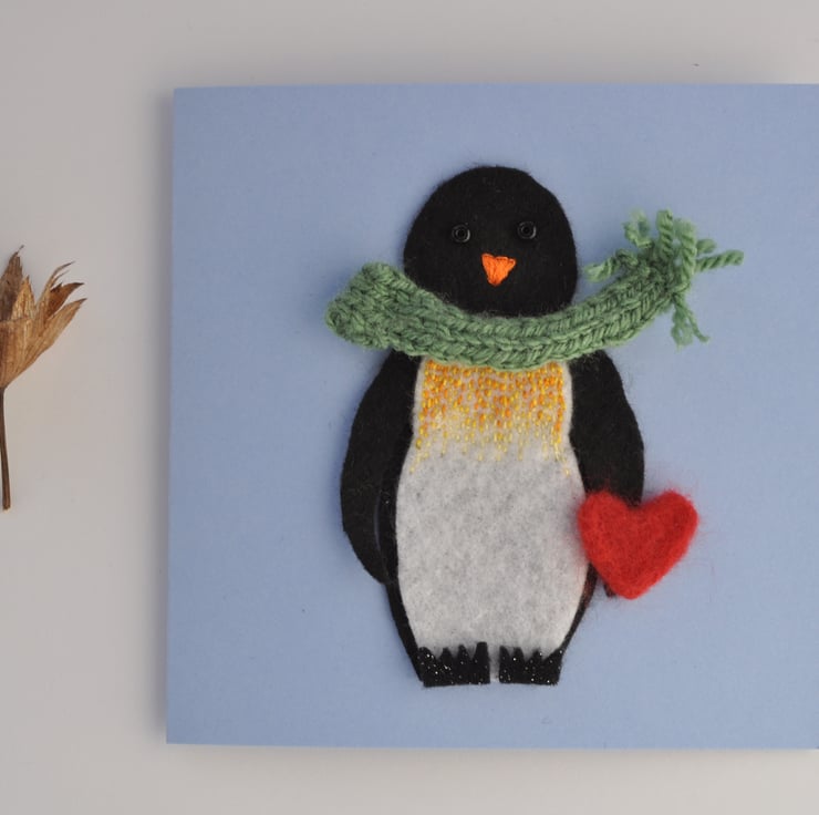 Cute felt penguin with needle-felted heart greeting card. Front of card can be personalised. Small hand-knitted scarf can either be red, green or blue. Please select from drop-down menu.