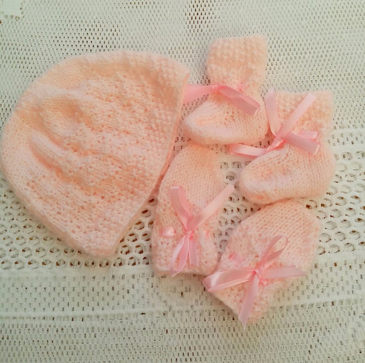Very attractive 4 piece cardigan set comprising cardigan, hat, mittens and bootees. The set is knitted in 4 ply weight yarn and can be made for sizes from premature to 1 year. It is not currently in stock but it can be made for you in any of the sizes shown below and a colour of your choice. Please state the colour required when you order. The processing time to make a this set for you will be 1 - 2 weeks to produce and post out to you.