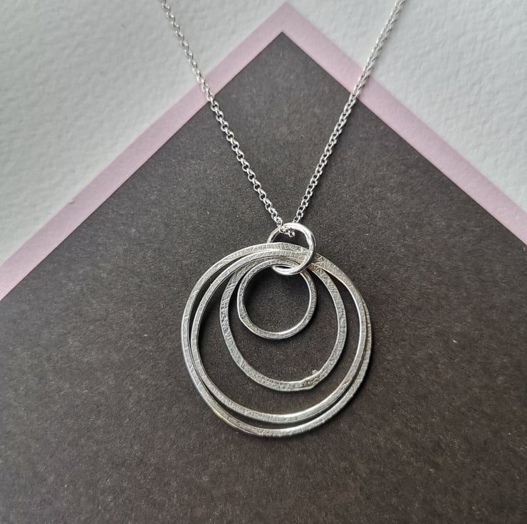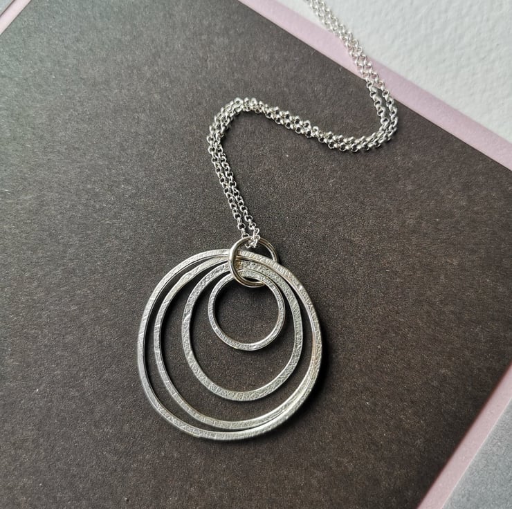 This gorgeous necklace is made up of 4 circles, which have been imprinted with a subtle leaf print design. The sterling silver pendant hangs on an 18" sterling silver belcher chain.