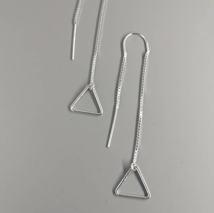 Sterling silver triangle threader earrings hang approximately 5cm long. Simply thread through the ear for a comfortable, elegant look!