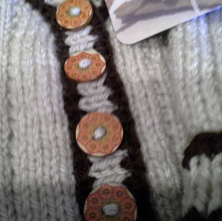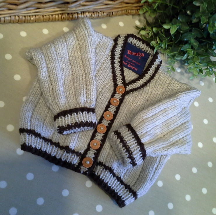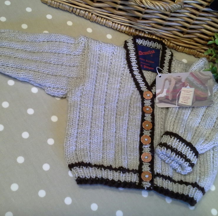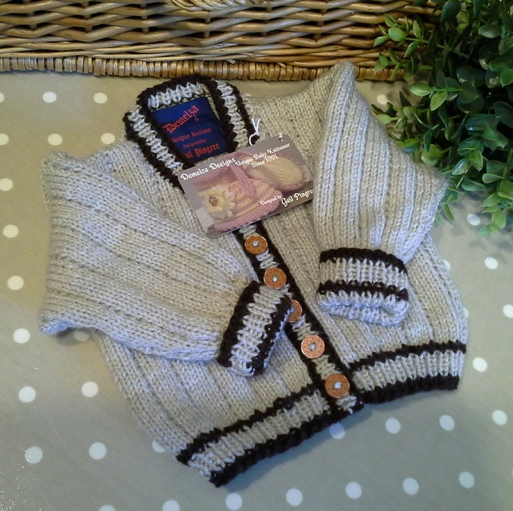 A practical everyday wear cardigan designed and lovingly hand crafted using quality branded British manufactured yarns. The yarns are machine washable at low temperature. The buttons are made from genuine wood with a design on them. The item has the branded Demelza garment label attached to the back neck edge with the care instructions woven on the reverse side.