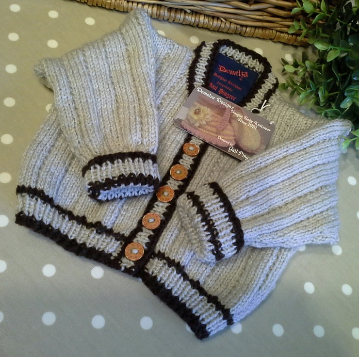 Baby knitwear is designed and hand crafted by Demelza Designs in Cornwall meeting UK baby safety standards, Only branded premuim acylic, acrylic/natural fibre blends or pure natural fibre yarns are used in baby knitwear which conforms to BS984/76 standards.