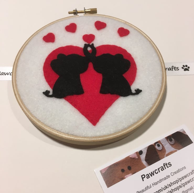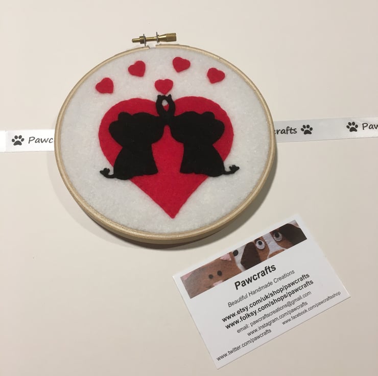 The Elephant silhouettes are made from Black Felt and are hand stitched onto a Red heart. From their trunks they are blowing hearts into the air.
