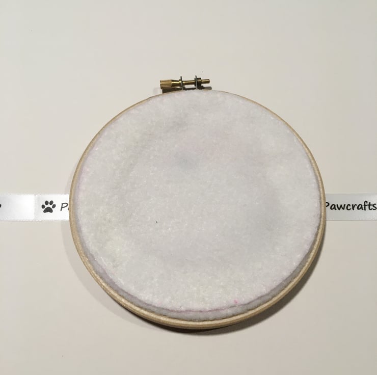 The Elephant's and hearts are stitched onto a cream fleece fabric. The reverse of the hoop art is the same cream fleece fabric. A ribbon is attached to hang the hoop.