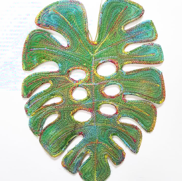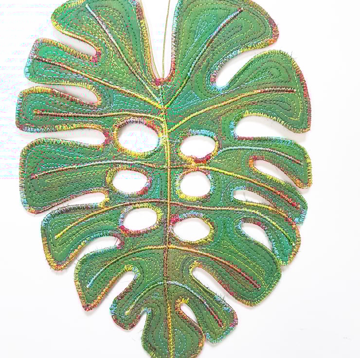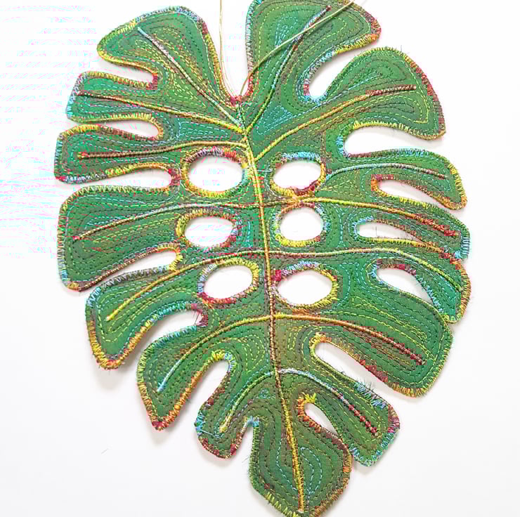 This is a handmade machine stitched fabric monstera leaf hanging decoration