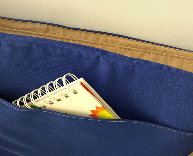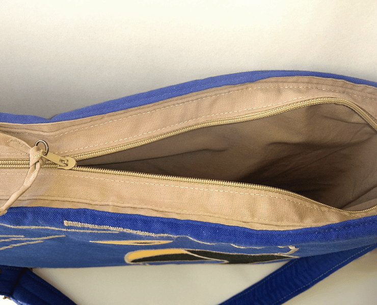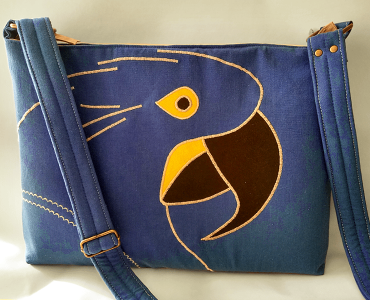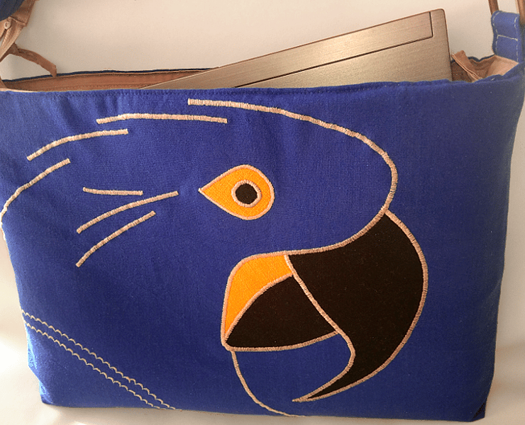 The main colour of this padded laptop bag is royal blue and is inspired by hyacinth macaws, hence the flashes of yellow. The macaw features are appliquéd on the front of the bag only. The back has a large slip pocket secured with Velcro.