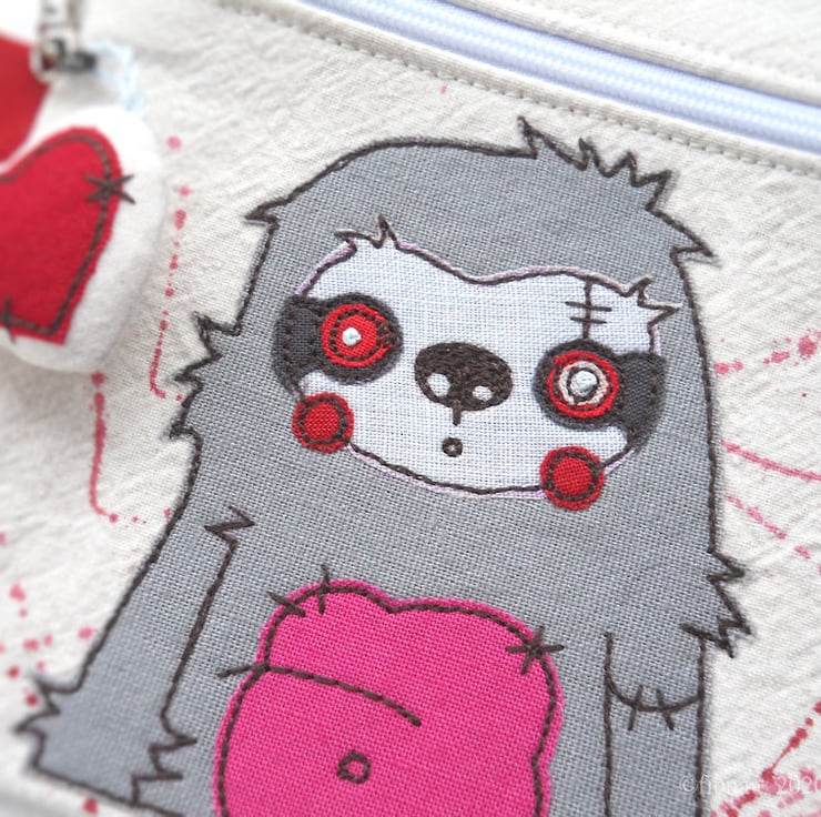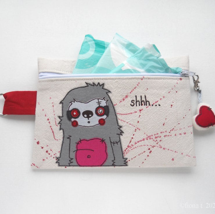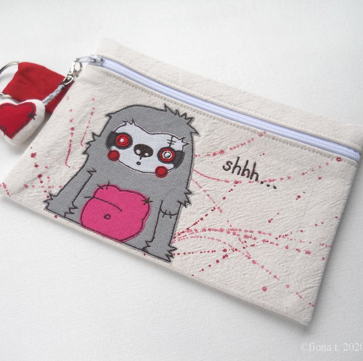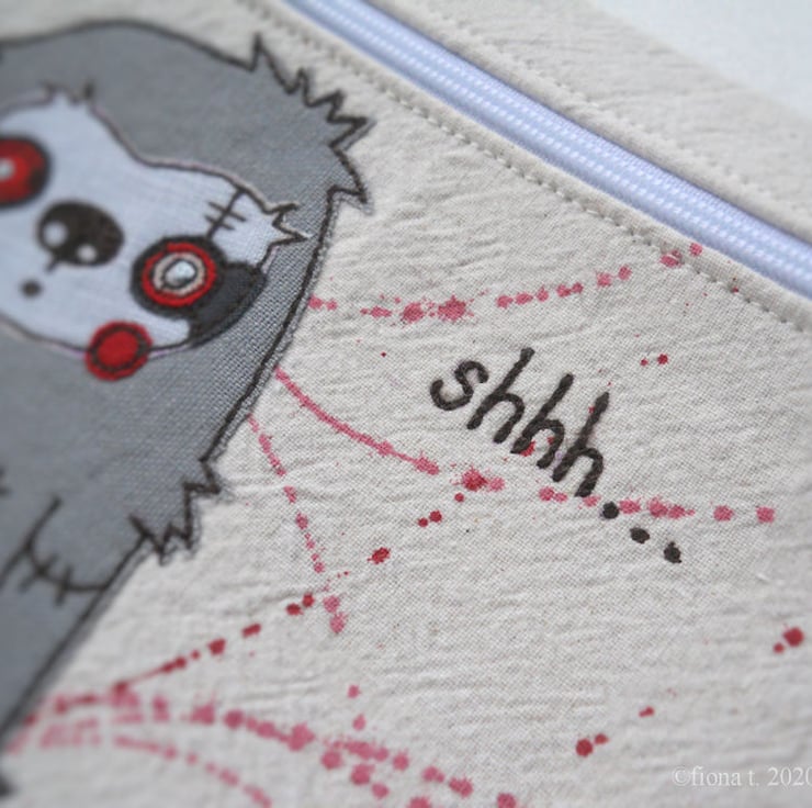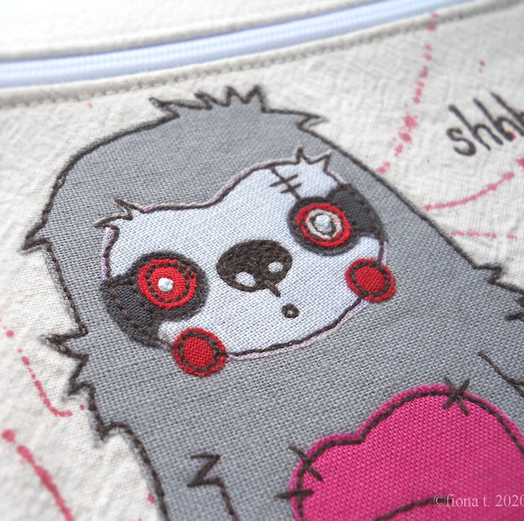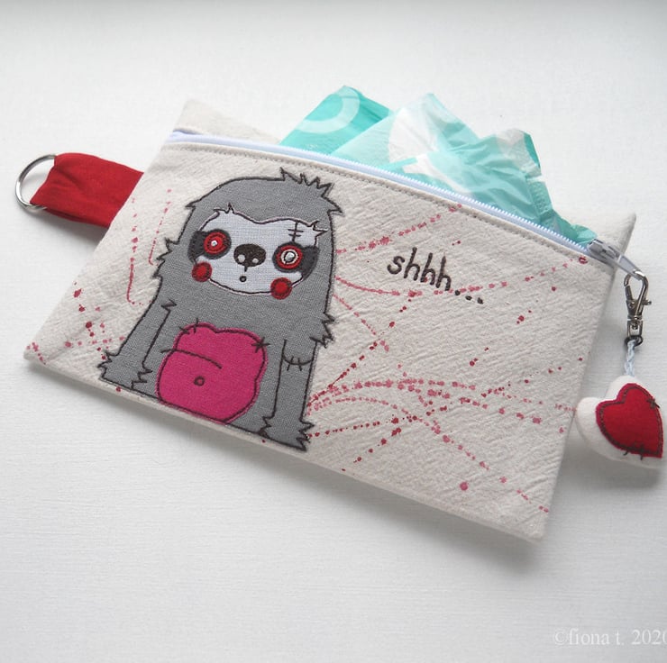 this anxious zombie sloth is constructed from pink & red cottons and grey cotton linen. she angsts "shhh..." against a blood spatter background.