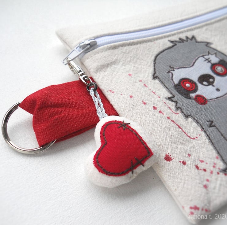 the co-ordinating hanging loop is extra securely fastened. the attached zombie heart bag charm is not.