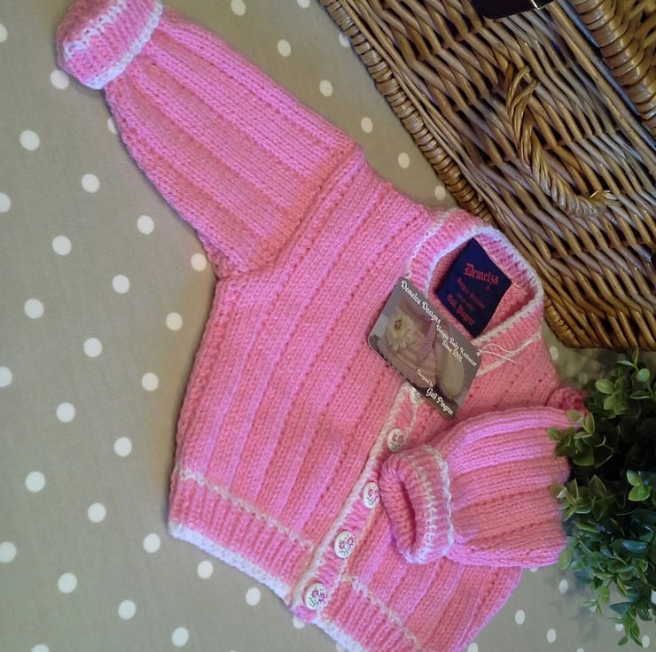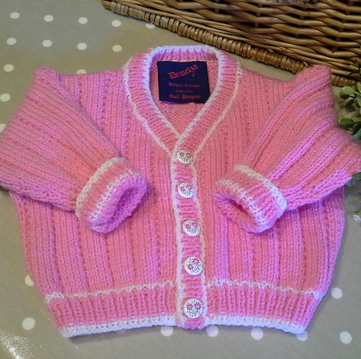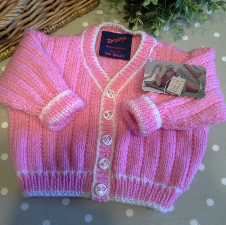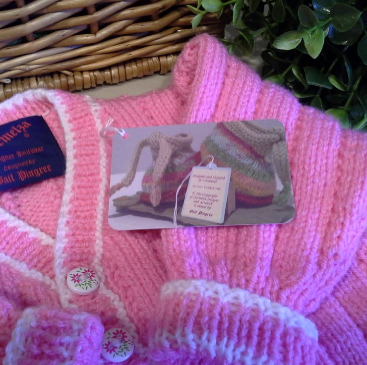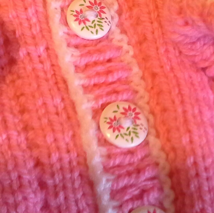 A sweet practical everyday wear baby girl's cardigan designed and lovingly hand crafted using quality branded French manufactured yarn. The yarn is machine washable at low temperature. The buttons are made from genuine wood with a delicate floral design on them. The garment has the branded designer label attached to the back neck edge with the care instructions woven within it on the reverse side.
