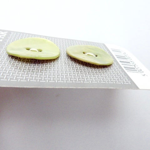 These round, 2 holed buttons are made of dyed mother of pearl. The lime green colour is unusual. The curved surface mirrors the contours of the shell and catches the light. Each button has unique variations.