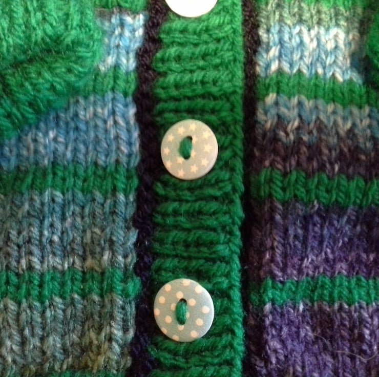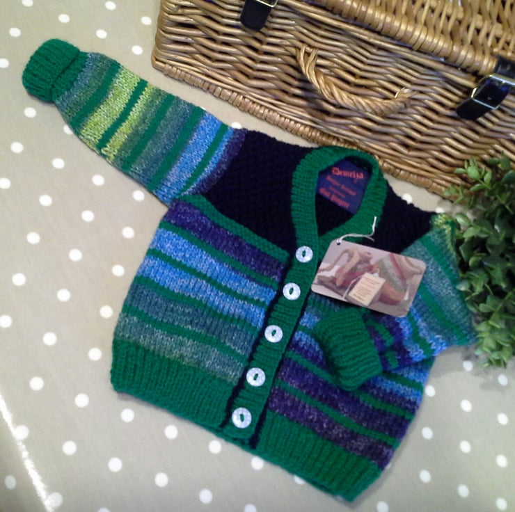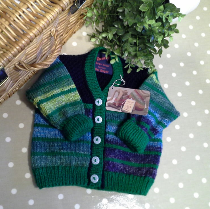 A very eye catching baby boy's cardigan designed and lovingly hand crafted using quality branded British and French manufactured yarns. All yarns used are machine washable at low temperature. The buttons are made from genuine wood with a polkadot design on them. The item has the designer garment label attached to the back neck edge with the care instructions woven within it on the reverse side.