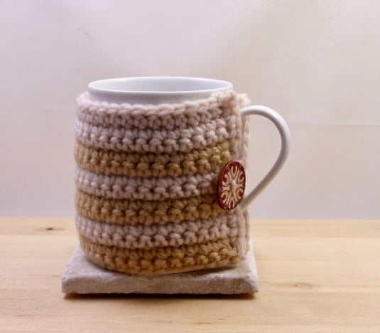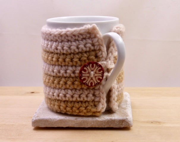 A crocheted mug cosy in dark beige and pale coloured chunky yarns which are 100% acrylic. The cosy measures approximately 25cm long by 9cm wide so should fit most standard mugs. Just wrap it around and fasten with the crocheted loop and patterned wooden button.