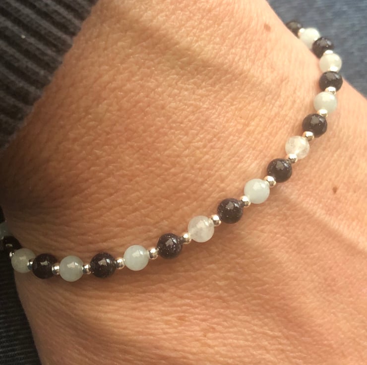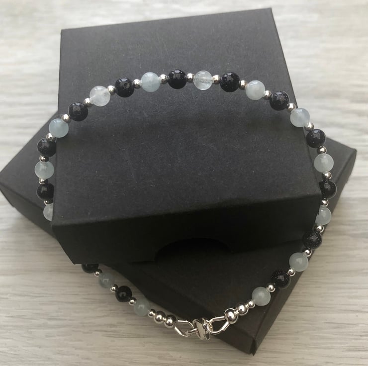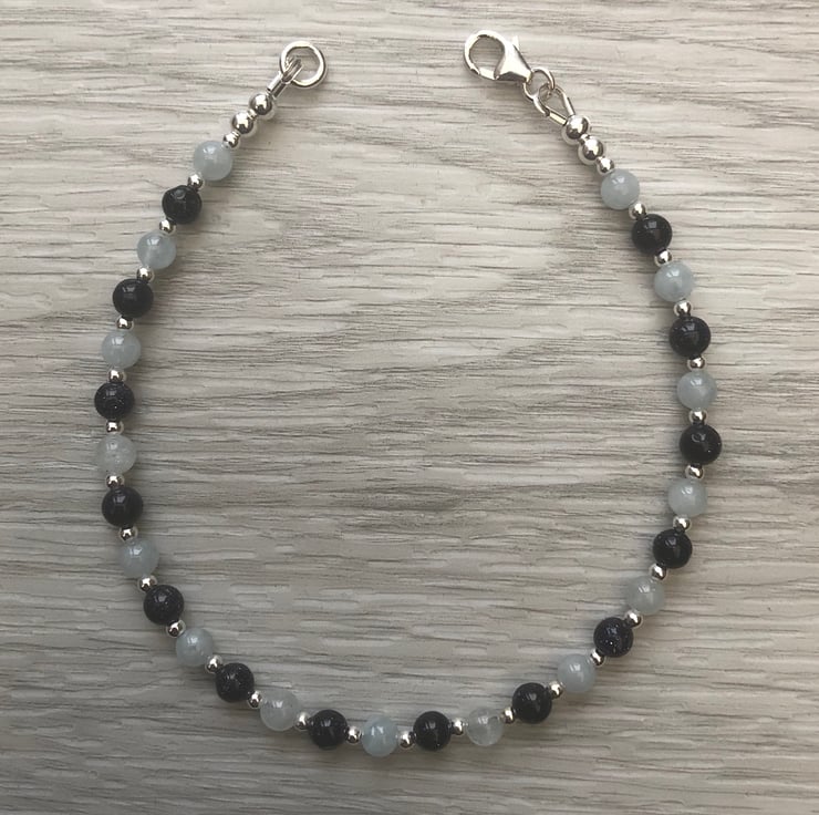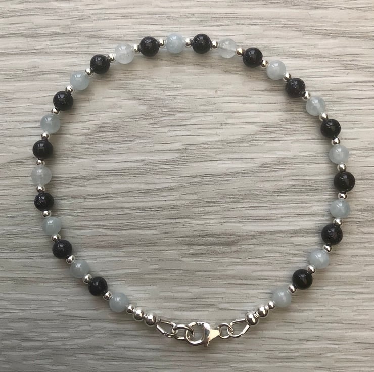 Made using 4mm alternating blue goldstone and aquamarine beads along with sterling silver beads. Hand wired onto strong tiger tail beading wire. Fastens with a sterling silver lobster clasp.