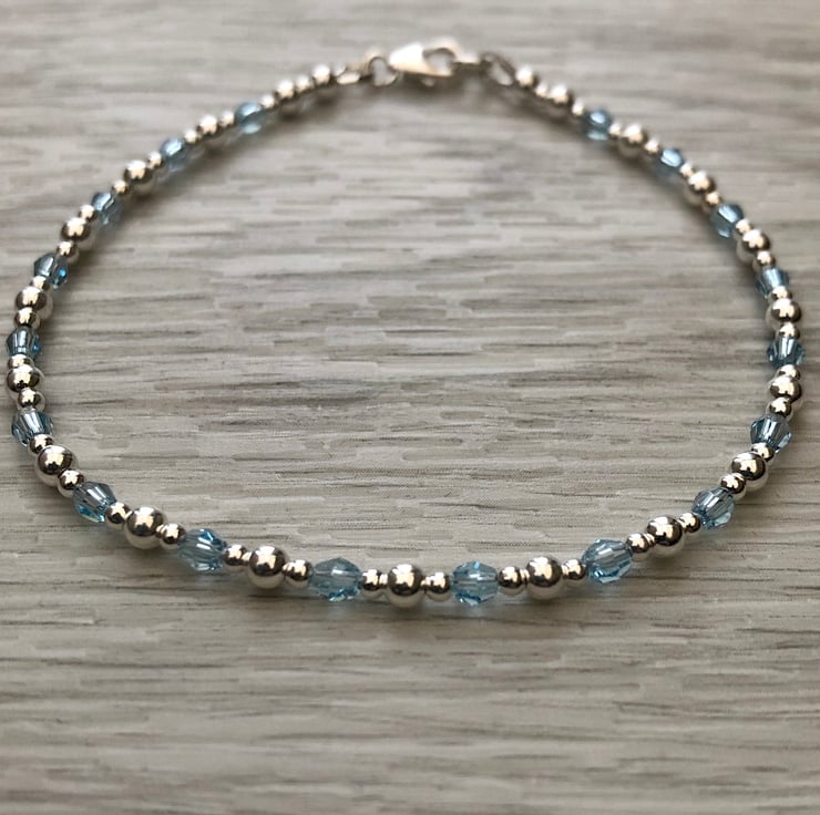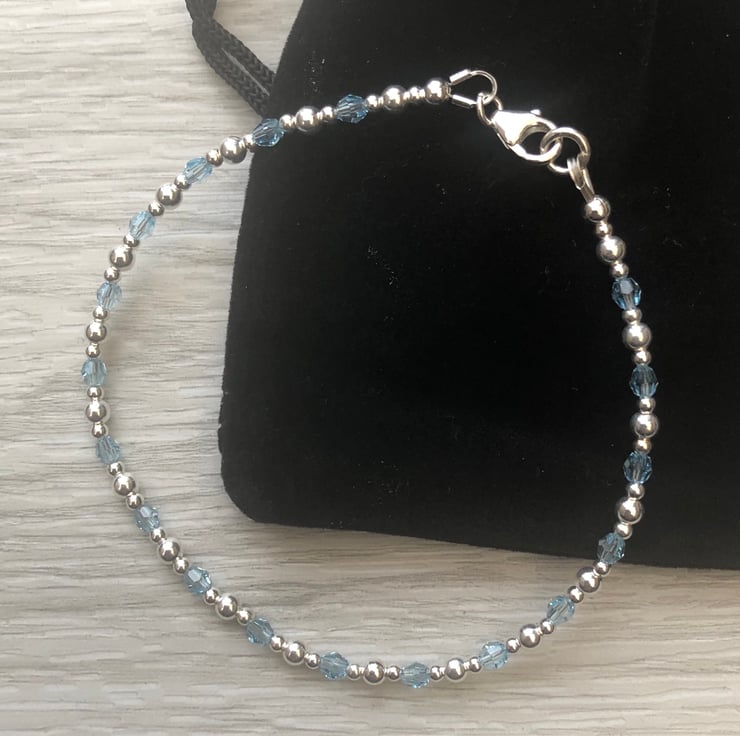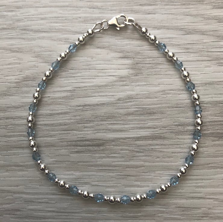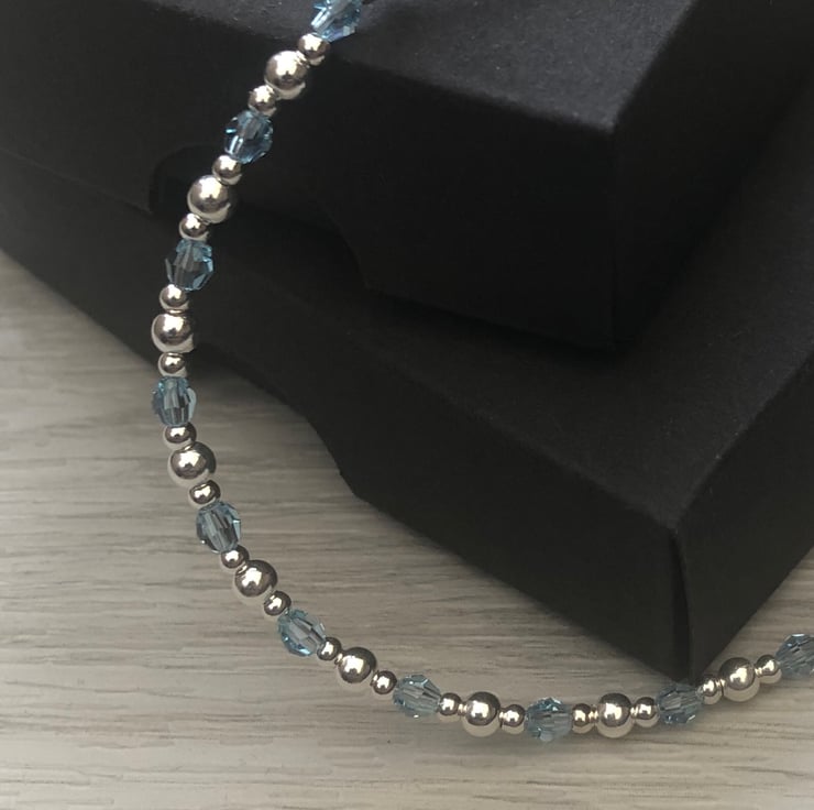 Made using 3mm aquamarine Swarovski beads along with 2mm and 3mm sterling silver beads. Hand wired onto strong tiger tail beading wire. Fastens with a sterling silver lobster clasp.
